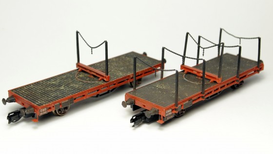 Jak už jsem napsal, stavebnice těchhle vozů výrobce uvedl na trh už loni v červnu, ale chvíli mi trvalo, než jsem se k nim prokousal hromádkou modelářských i nemodelářských zdržení. Jedná se o vozy oplenové, přičemž každý vůz je mírně odlišný, jeden je vybavený pouze oplenem, druhý i klanicemi. Jak se mi začaly doma příležitostně množit i modely vozidel ze III. provozní epochy, rád jsem k nim do party přibral i tyhle dva, neboť svým provedením i obtiskem právě sem na časové ose zapadají.