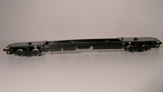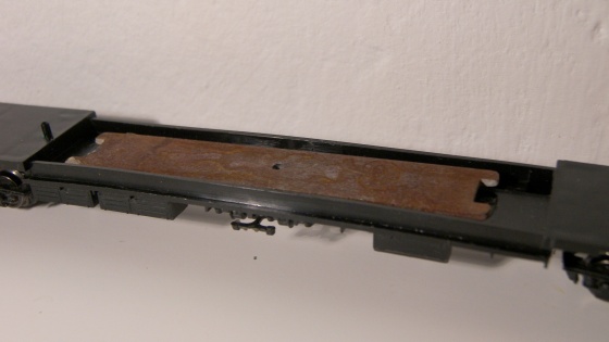 Takto upravený vůz už sice váží tak akorát na normu, ale při jízdě to moc dobroty nedělá. Vůz je prostě moc dlouhý. Už chápu pana Kuehna, jehož patrové vozy jsou hodně „převážené“. Proto jsem ho ještě o pár gramů přitížil závažím do středu pojezdu. Výsledná hmotnost kompletního vozu je 61 gramů, což je hmotnost, která se mi v prvních testech osvědčila i pro delší soupravy. Souprava ve složení Es + Bmto + 3x B (upravené) + Es projela esíčko na R310 bez problémů.