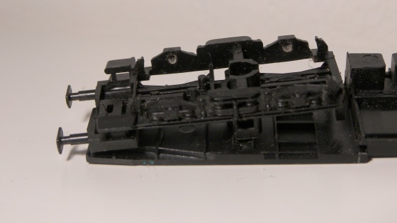 • Já už mám dva vozy přestavěné a i kinematiky se vešly. Uchycení zkouším tak, že ten kovový zobáček od podvozku zahnu po nasazení rámu. Když to nedrží (většinou tam zůstane nechtěná vůle) tak pak přijde na řadu šroubek. Ten zobáček se ale odstraňuje špatně, proto jsem se tomu chtěl vyhnout. Příště to zdokumentuju…
