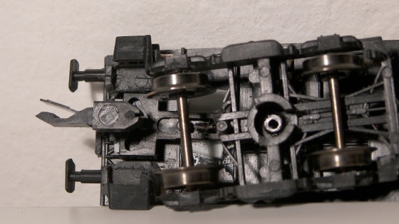 Taktéž výšku si musíme určit sami.Postupujeme takto, hlavu začistíme a usadíme do kousku modelíny(plastelíny)nalepené na kolejnici, dle výšky originálního vozu, pak s upravovaným vozem Y najíždíme a najíždíme a upravujeme(přibrušujeme) držák kulisy.Je nutno mít už budoucí dvojkolí v podvozcích a dbáme ba to aby vůz byl středem koleje.