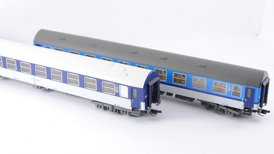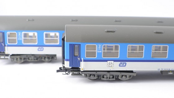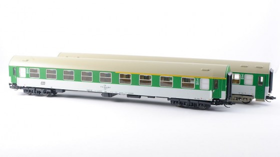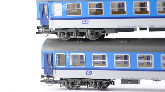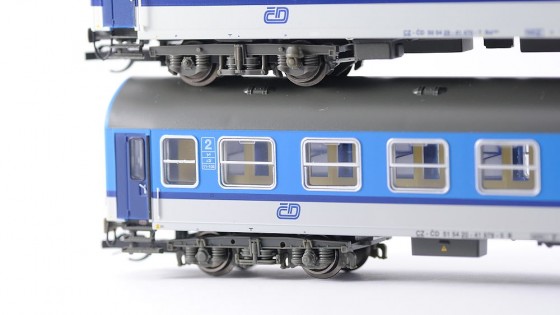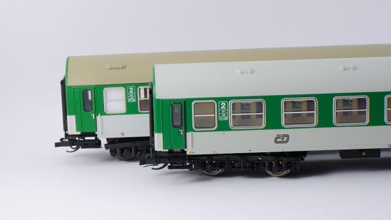 Oba vozy u sebe. Největší rozdíl jsou pro mě rámy oken – Tillig je má hranatější, vypadají spíš jako z vozů vyrobených ve Studénce na konci 80. let (např. řada Bdt).