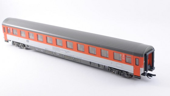 KUEHN’s model is based on the first batch of the type Y/B 70 built originally for Czechoslovakian State Railways (CSD) and because they had some financial problems CSD refused 101 first class coaches adapted with 9 compartments. German State Railways (DR) purchased them and modified some 50 coaches (not sure about the exact number) into second class coaches, the exterior was painted dark green typical color for DR at that time and gray roofs, DR did not want to spent too much time and money to modify the coaches to the DR standards, so the interiors remained the same for the first class coaches, each compartment had 6 individual seats covered with green color upholstery (fabric material) and the second class coaches got dark red color upholstery (same seat configuration as the first class coaches, 6 individual seats per compartment). That explains why these are the only second class coaches with 9 compartments. The bogies were type V Goerlitz equipped with DAKO braking system used by the CSD, DR uses KNORR brake system (see TILLIG’s models). After the introduction of the STADTEEXPRESS train there was a quick need of some first and second class coaches so these some of these or all 101 coaches became donors to make part of the train and the exteriors were painted (only were green area was covered) with cream or ivory color the top half and mandarin or orange color the bottom half.