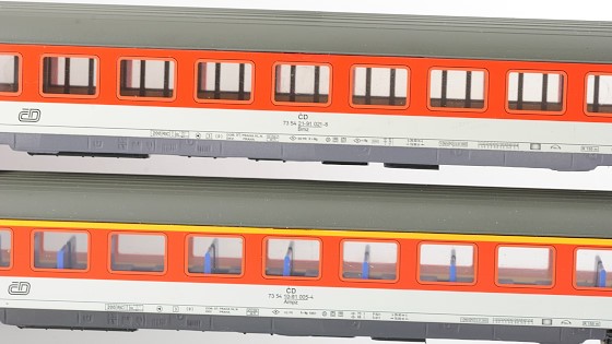Ještě jeden smutný pohled na čela z jiného důvodu – když pominu, že jsou na nich vidět možná zbytky lepidla při lepení bočnice k čelu a střeše a nějaké přechody podobných odstínů barev z povrchové úpravy, tak je zde ale vidět jako plus dvě rozdílné provedení střechy. Nižší a vyšší. Ten vůz vlevo je WLABmz z vagonky v Mariboru, která pro ČD dodávala tyto vozy, a tam jsou střechy skutečně takto vyšší. Takže bod pro TT-model, že dokáže odlišit další rozdíl ve vozech.