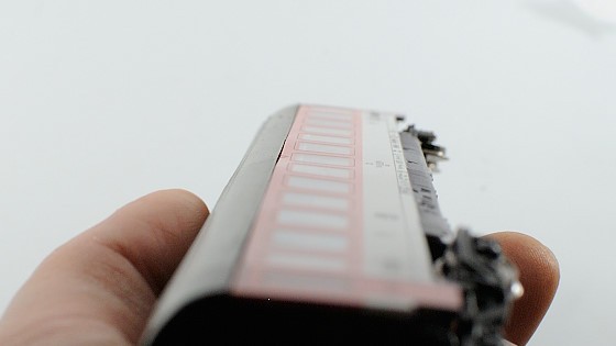 Zde se můžu zastavit i nad dalším nešvarem konstrukce – střecha je lepená k bočnicím a to ne vždy úplně dokonale. Nad posledním oknem vpravo trošku prosvítá a spára není všude úplně stejná. Za pozitivní vypíchnutí stojí určitě lampičky v interiéru a celkově provedení interiéru je dobré.