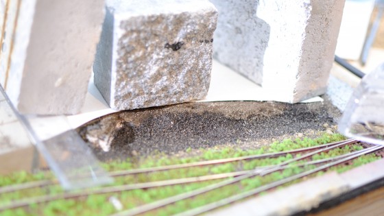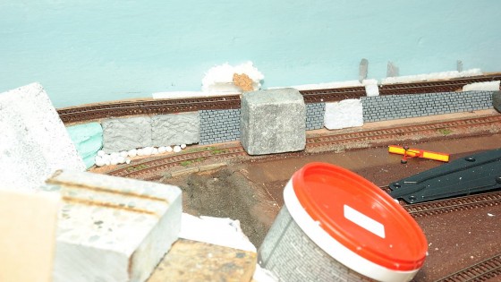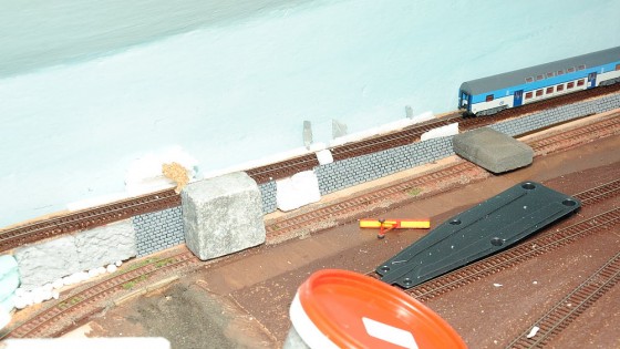 V pozadí jsem si práce dost zjednodušil, chtěl jsem původně kyklopské zdivo, ale opěrná zeď z obyčejných kamenů od Malé Železnice byla zrovna při ruce, tak jsem jí nastříhal a nalepil.