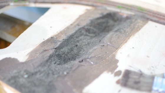 Z tenkého kartonu jsem vystřihnul silnici k nakládkovému místu a uhelným skladům. Škarpa je vytmelená lepidlem na stropní kazety – husté disperzní lepidlo. Lze na to použít relativně cokoliv hustého, co zaschne do požadovaného tvaru.