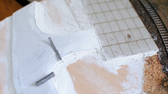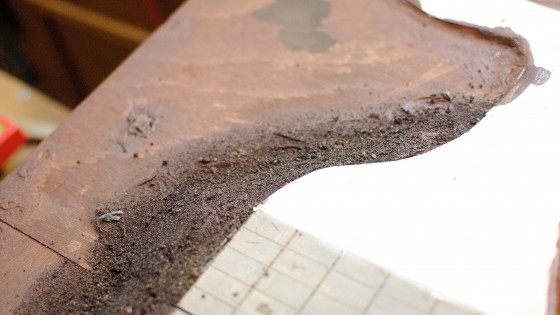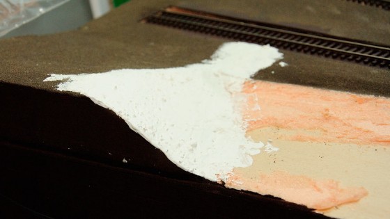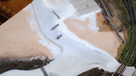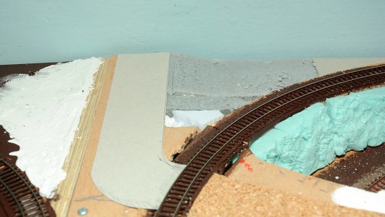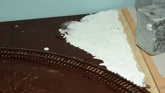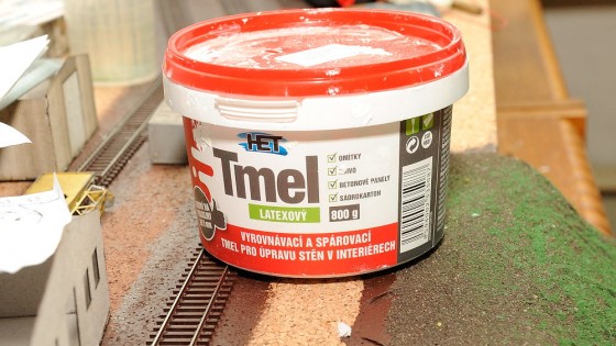 K dotvarování krajiny jsem použil latexový tmel, který jsem měl doma zbytečný. Zatmelí spáry, rovnou je zalepí, dá se tvarovat pěkně rukou a po vyschnutí je tvrdý. Je to vlastnostmi velmi podobné, jako to lepidlo na stropní kazety.