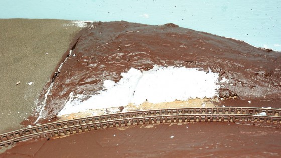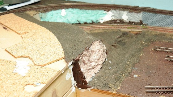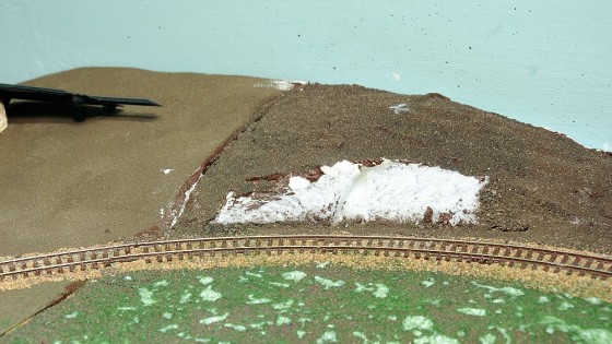 A zbytek oblouku jsem dotvaroval z nalámané extrudovaného polystyrenu – tenhle lom je v zásadě přirozený, a jen lehce doškrábaný „mnitkovou“ (od slova Mnitka) metodou přejížděním nožem. Původně zde měl být násep, chtěl jsem mít kromě nuly tunelů i nulu skal, ale opět jsme to z prostorových důvodů přehodnotil, bylo by to zase „těsné“ až nepřirozené. Zakryju většinu skal stromky nebo křovím.