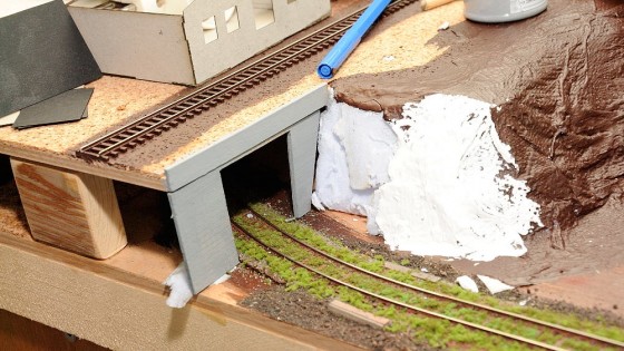 Na kolejišti se nebude nacházet žádný tunel, vjezd do skryťáku bude krytý betonovými „mosty“ – tunely by vypadaly s ohledem na nízkou výšku dalšího patra směšně, vlastně by přesahovaly portály výšku samotného patra. Tady jsem si připravil základ betonového podjezdu, překlad je přilepená na horní patro a pod to je vsazený základ budoucích pilířů. Ještě přijde obalit nějakým krycím papírem z boků.