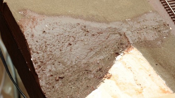 Celou příjezdovou cestu jsem prsty přetmelil tmelem/lepidlem – bude to možná nějaká hliněná cesta napojující se na betonové panely. Pod tmelem je opět karton, ale pro vytvoření struktury a vyježděných kolejí jsem ve směru jízdy automobilů přejížděl mokrými prsty namočenými v lepidle, než se vytvořila jakási hrubost.