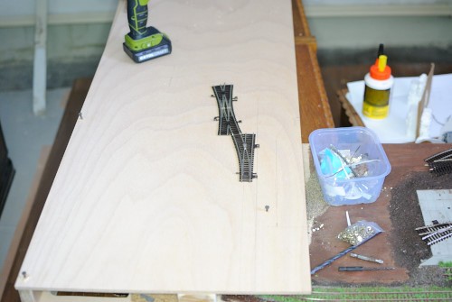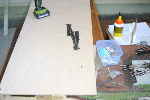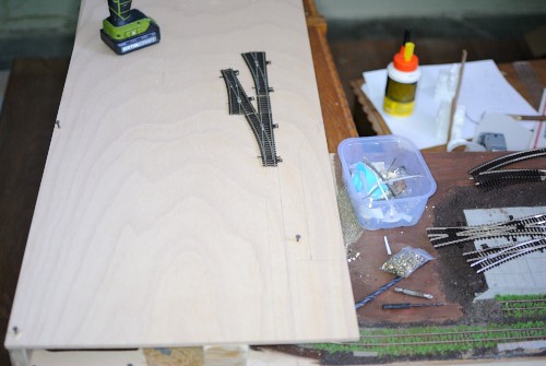 Vlečka nakládkové koleje končí cca „2 vozy“ za obloučkem, budoucí skladiště reprezentují zatím prkýnka. Bude zde malá vlečka skláren – expediční sklad (v Posázaví se vyskytují) a skládka příchozího zboží (konečně využiju vozy Sklmmp na přepravu kyselin), navíc nebude potřeba na tuto kolej manipulovat tak frekventovaně.