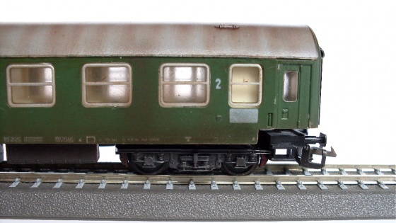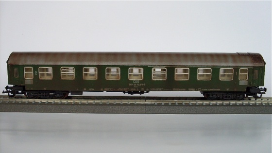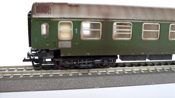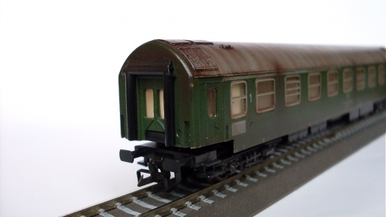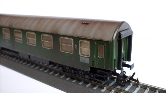 Nebojte se ani míchání vlastních odstínů, v provozu se také setkávají vozy různě špinavé. A soupravu to jenom pěkně ozdobí. Tenhle můj vzorek jsem chtěl udělat trochu špinavější, takže spodek vozu je trochu zašlejší, střecha by možná snesla víc, prostě pokus. Aspoň mám novou zušenost a nebudu se tolik bát špinit Kuehnovic novinky.