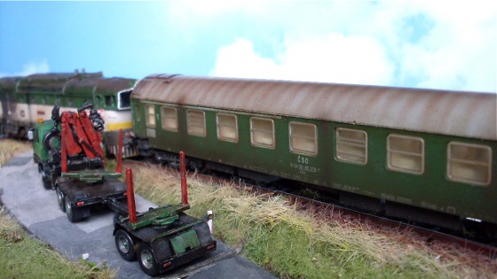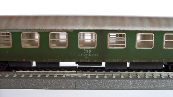 Rychlík už nám sviští přes přejezd a nabaluje na sebe přitom další špínu. Patina tedy modelům vdechne zase jinou tvář a obzvlášť takhle dlouhým a krabicoidním vozům v přiměřené míře prospěje.