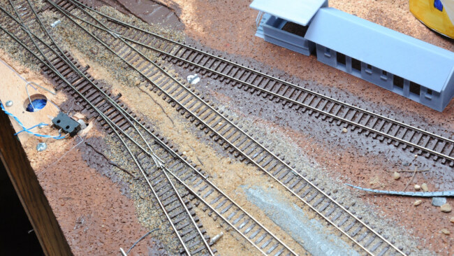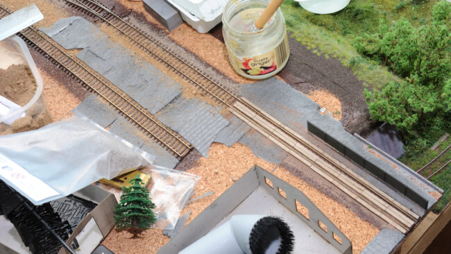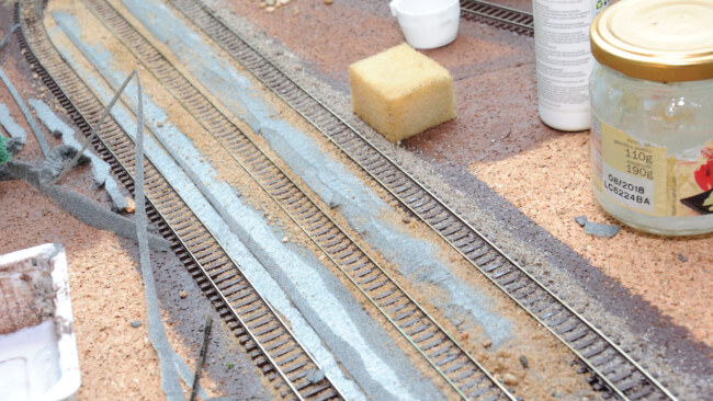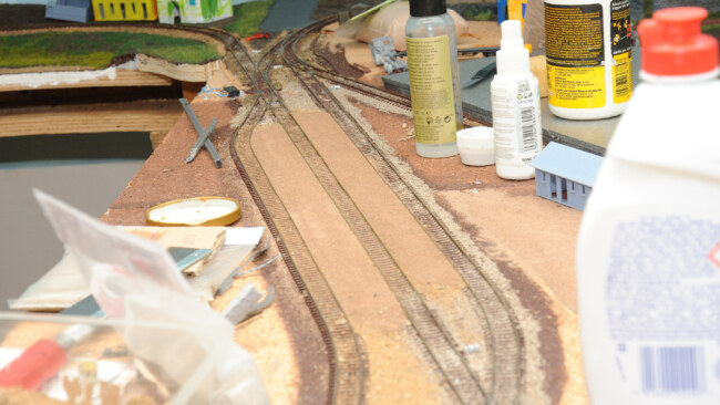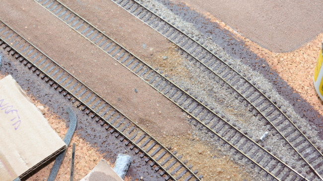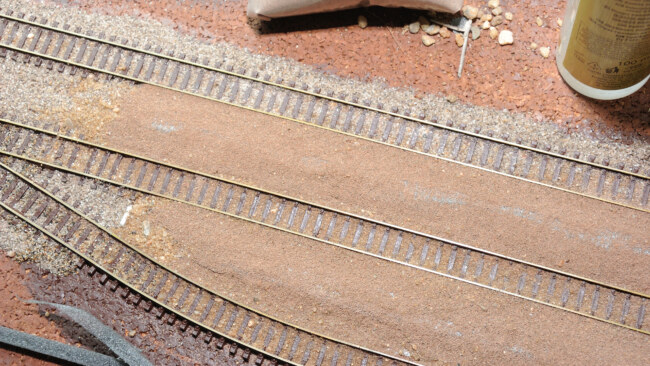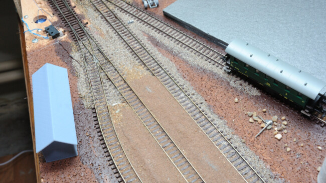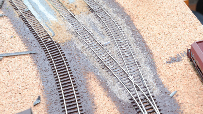 Nyní přichází na řadu štěrkování a patina kolejí – já osobně preferuji nejdříve štěrkování a pak patinu, protože přestřik barvami sjednotí odstín kolejí s odstínem pražců a vše k sobě lépe ladí, než mít rezavé koleje a čistý štěrk. Mezi výhybkami štětcem dopatinováno opět černou křídou jako mastnota. Kdo by ale tvořil nově položené koleje, tam dává patina prutů před zaštěrkováním rozhodně smysl.