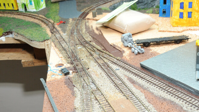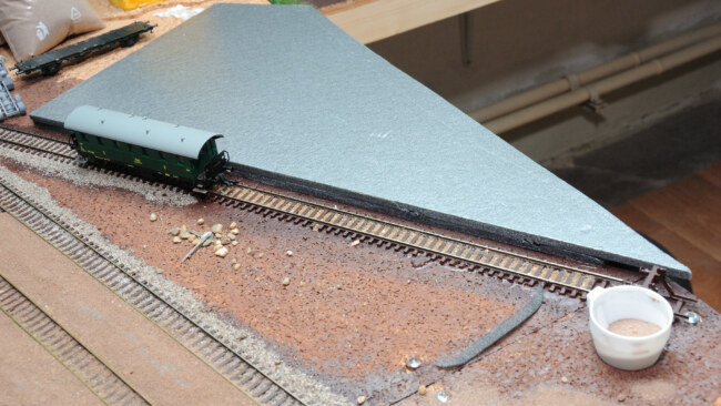 Prostor vykládkové koleje jsem trochu dorovnal styrodurem, aby byla kolej zhruba v úrovni země.
