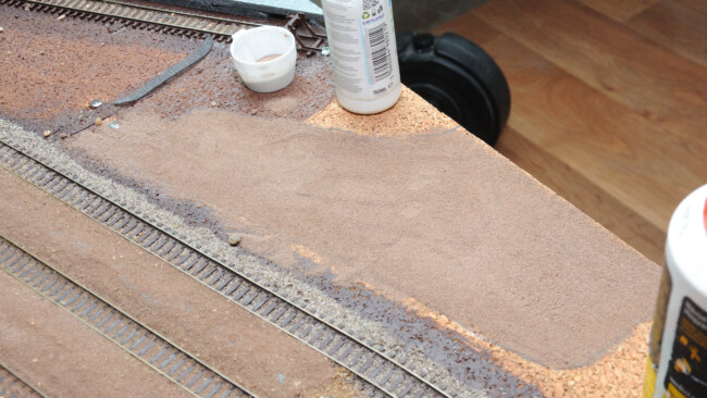 Písek jsem sypal všude mezi koleje, kde pak přijde přesyp hlínou a následně vysetí statické trávy.