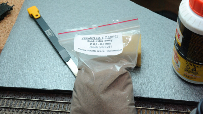 Nástupiště jsem na vršku přesypal prachem od Verama (mají takové červenější podkrkonošské odstíny, vypadá to ale pěkně).
