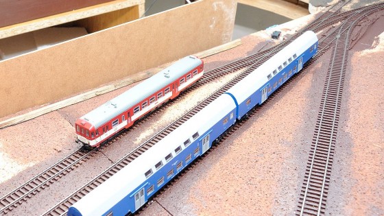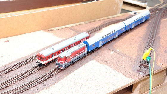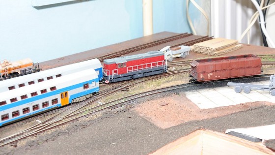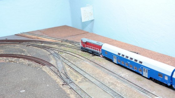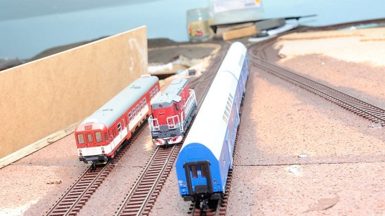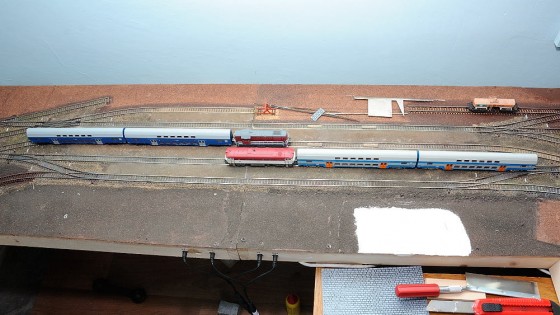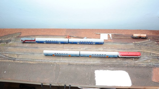 Jsou dvě možnosti, jak vlaky srovnat. Buďto lokomotivami k sobě, nebo naopak lokomotivami k námezníkům. Když je nádraží dost dlouhé (jako ve skutečnosti), tak běžně přijedou soupravy lokomotivami k sobě tak, aby cestující mohli k oběma vlakům bez obcházení blíže stojícího, ale taky, aby přijížďějící lokomotiva nevjela do potenciálního pohybu cestujících. Na kolejišti je to často „na chlup“ od námezníku k námezníku – není od věci mít soupravy kratší, než je užitná délka koleje, i za úkor určitého ústupku. Lépe se pak modeluje jakýs-takýs provoz. Kvatro stojí na koleji, která byla původně míněná jako skladištní (nakládková), ale z důvodu nedostatku kolejí jí budu muset využít jako „hybridní“, kdy bude sloužit pro motorák nebo nákladní vozy. Jak už jsem říkal, jediná kolej pro odjezd/vjezd na Měchenice je prostě málo a zpětně bych to hodnotil jako určité provozní omezení, nebo možná spíš provozní výzvu.