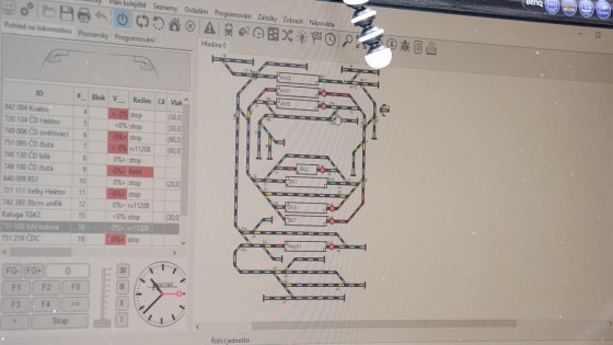 Pohled na obrazovku Rocrailu – v toto chvíli je obsazena měchenická kolej (ve spodní části červená), ve Vraném stojí dva vlaky na 2. a 3. koleji, a ve skryťáku jsou 3 ze 4 sledovaných kolejí obsazené.