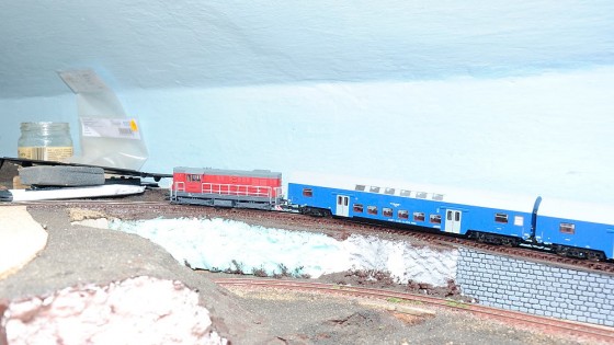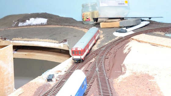 A za 5 vteřin už se blíží do koncové stanice. Můžete si všimnout, že jsem docela pohnul s krajinou, aneb co udělá trocha polystyrenu, tmel a hlína.