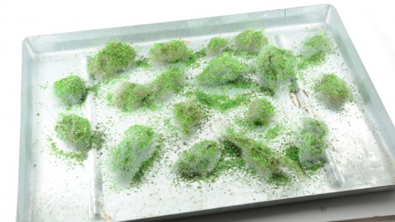 Chuchvalce jsem si naložil na tác (je jedno na co, jen to musí jít odlepit a nesmí to sát vodu, takže ne na papír) a přestříkal jsem je hodně naředěným disperzním lepidlem z malého rozprašovače (hodí se něco velikosti přírodního spreje na tělo a domácnost, jako má třeba Avon – dělá to přiměřenou mlhu a nemá to mega proud).