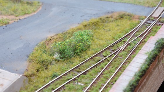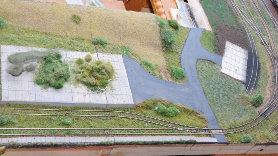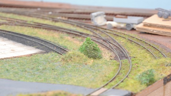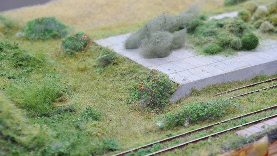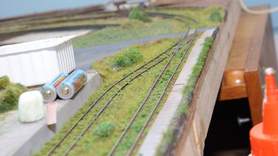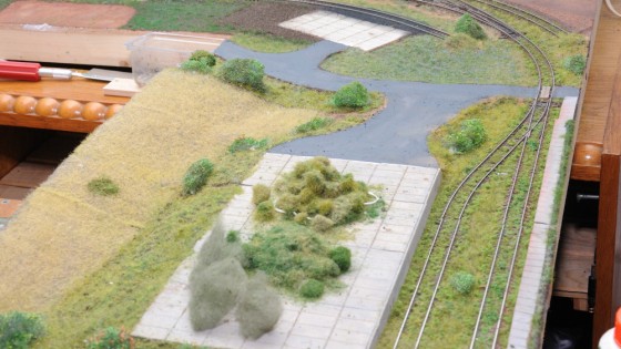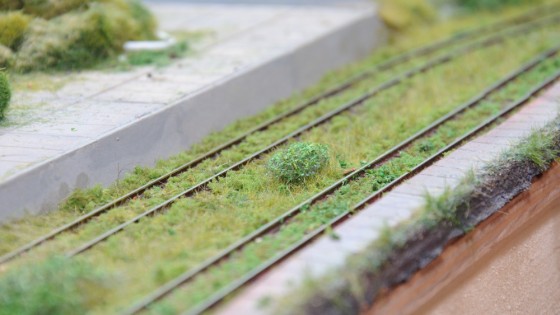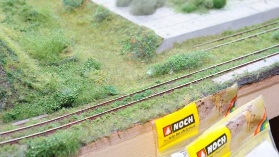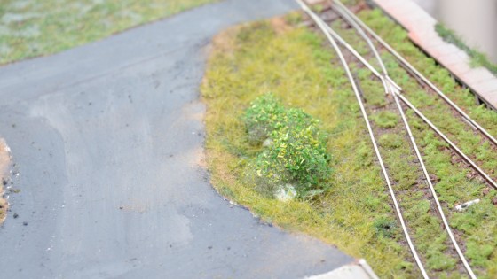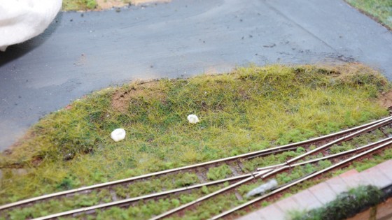 Na tácu mi zbyly hromádky vlhkých posypů, které se nechytily na keře. Zkusil jsem je vzít, a zjistil jsem, že z nich jde pěkně vyplňovat prostor v kolejišti, zrovna třeba mezi kolejemi.