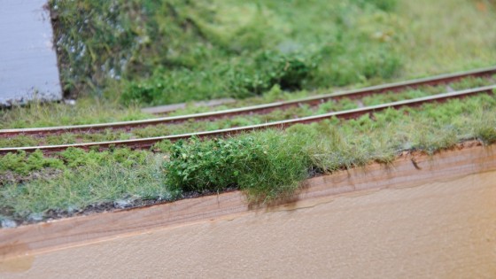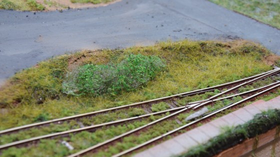 Tady je jeden z prvních pokusů – přesypaný ještě hnědým Naturexem a to celé přímo na kolejišti. Nejprve jsem vlepil chuchvalec filcu, pak přestříkal a pak přesypal a znovu přestříkal.