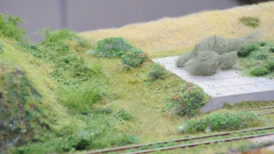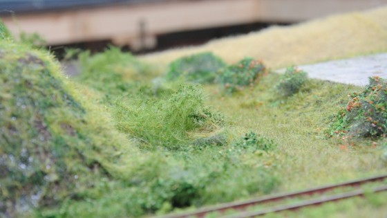 Tady je „velké keřové údolí“. Celá část vlevo je z křovin Model Scene (nízké) a Polák (vysoké). Proti tomu stojí vpravo doma dělané keře. Struktura je velmi podobná.