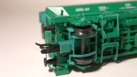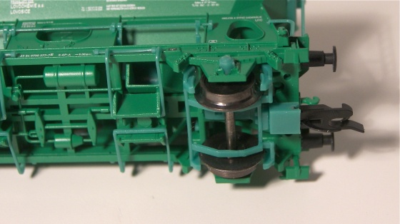 Provedení podvozku je velmi propracované. Uložení dvojkolí je hrotové, ale vůz nejezdí dokonale volně. Některé vozy vám při sebemenším klesání ujedou, tento potřebuje trochu pošťouchnout. Dvojkolí je přikryto docvakávacími brzdovými zdržemi.