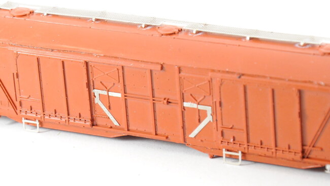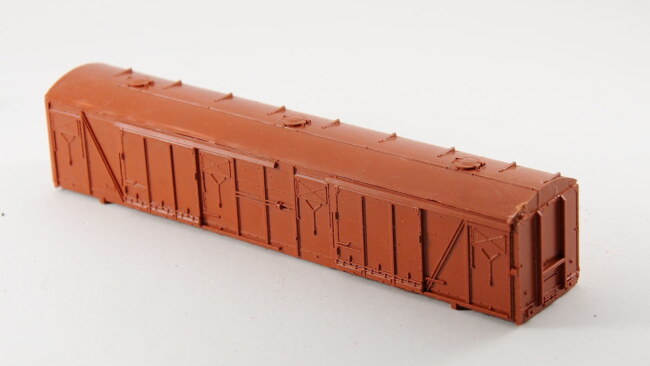 Pak už to jde ráz na ráz. Červenohnědou používám v poslední době už jen základovou barvu ve spreji. Pro stříkání jsem si nalepil tavnou pistolí zevnitř špejli. Pak nanést obtisky (nedávám už ani lesklý podklad), je potřeba vybrat z čísel a variant ČD / ČDC správnou kombinaci. Na závěr přejedu obtisky lehce Hypersolem a nechám uschnout.