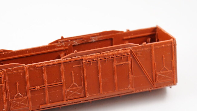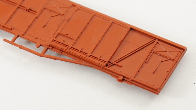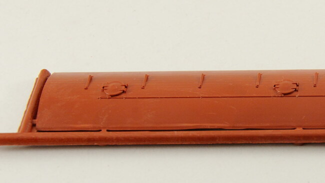 Střecha zaujme tím, že její povrch je trochu „lámaný“, jako by se ohýbal lept podle drážek. Fotku skutečného vozu jsem nenašel, ale i na výlisku jsou znát nějaké šrkábance po leštění nebo zahlazování.