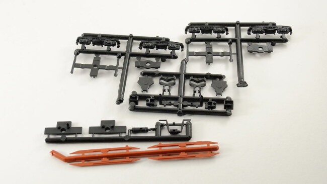 Složení podvozků bylo popsáno už tisíckrát. Na těch SDVčkových jsou proti LPH opět nálitky, je potřeba vše očistit a lepit lepidlem na plasty, které „odleptá“ případné zbytky nálitků. Podle návodu pro poloměry menší než 400 mm (což je každá EW1 výhybka) je potřeba zkosit hrany podvozků – na fotce to není moc vidět, ale je to tak, aby umožnily podvozky větší rejd pod výztuhami pod vraty.