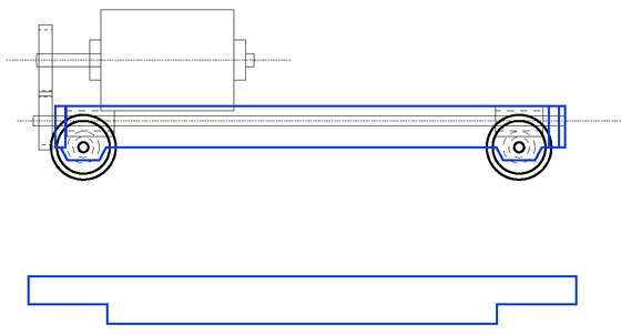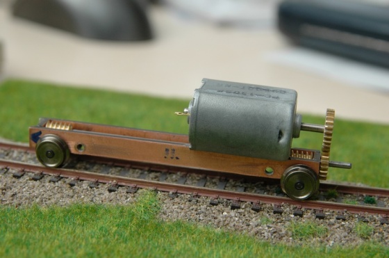 Pri stavbe pojazdu som sa nechal inšpirovať jedným z popisovaným na tejto stránke. Najprv som si pojazd nakreslil v počítači aby som dopredu vedel ako to bude vychádzať a či vôbec bude. Použil čo najviac súčiastok z domácich zásob okrem prevodov a náprav som mal doma všetko takže celá stavba je tomu prispôsobená. Základný rám pojazdu je vyrezaný z 1,5mm obojstrannej kuprexitovej dosky na plošné spoje. Tento materiál som použil preto, lebo sa dá ľahko rezať, brúsiť je vodivý, dá sa spájkovať a je aj dostatočne pevný. Ako jedinú jeho nevýhodu by som označil nízku hmotnosť oproti často používanej mosadzi. Dve hlavné bočnice rámu majú rozmery 77×8,5mm. Do ktorých som vložil dvojkolia z ozubením. Na čelách rámu sú prispájkované čelá, ktoré držia osku so šnekmi pre nápravy. Na jednej strane je oska dlhšia aby bolo možné nasadiť ozubené koliesko. Motor som usadil na tento rám s patričným ozubeným kolesom. Viem že pomer zubov na týchto dvoch ozubeniach nie je ideálny, ale pre použitý motor mi to jednoducho inak nevychádzalo.