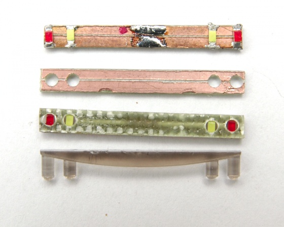 Medzi časom ako som striekal jednotlivé vrstvy farby som si pripravil osvetlenie. Z pásiku jednostrannej kuprexitovej dosky širokej 2,5mm som vyrobil hlavnú časť osvetlenia. Najprv som SMD LED diódy (tie najmenšie veľkosť púzdra 0603) prispájkoval na dosku zo strany spojov, ale prišiel som na to že takto by bolo komplikované prilepiť túto dosku na miesto a viesť od nej vodiče. Takže som to celé otočil, do dosky navŕtal otvory do ktorých som antiparalerne usadil LEDky. Takto som získal rovnú plochu vhodnú na prilepenie k upravenému výlisku svetiel zo stavebnice. Ten som upravil tak že som krajné časti odrezal neskôr samostatne prilepil do karosérie a potom aj vnútornú časť. Vzniknutú medzeru som vyplnil kúskom plastu, týmto som zabránil presvitaniu farieb do vedľajších. Celú dosku s LED doplnenú vodičmi som prilepil na takto upravené „svetlovody“ do karosérie. Je vhodné ešte celú zostavu natrieť čiernou farbou aby svetlo nepresvitalo tam kde to nie je žiadúce. Horný reflektor som vyriešil podobne, má dve LEDky na kuprexitovej doske.