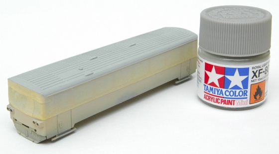 Páskou Tamiya som vymaskoval okolie okien a nanovo prestriekal strechu tentokrát som použil akrylovú Tamiyu XF-80 Royal light gray. Po zaschnutí a zamaskovaní strechy na boky prišla červená Tamiya XF-7. Pred tým som prilepil na spodok kryty motorov zo stavebnice. Na jednom som odvŕtal pôvodnú mriežku nasávania a nahradil ju krajším leptaným dielom.
