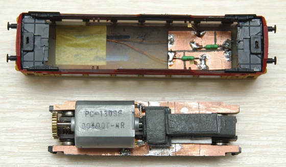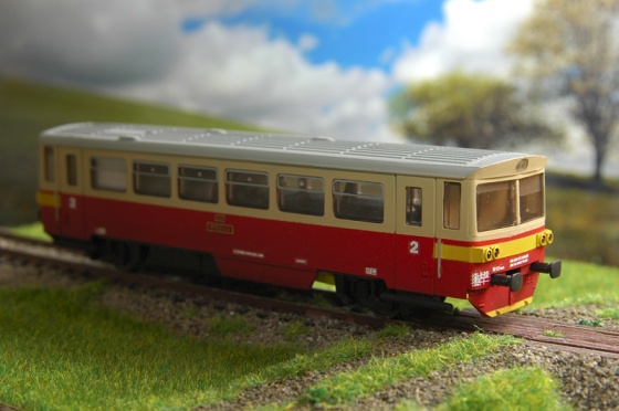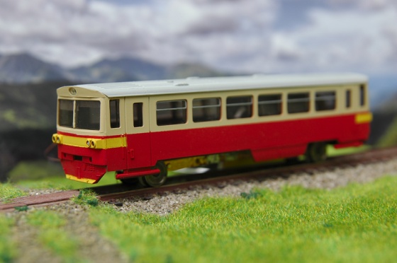 Karosériu som vyzdobil dekálmi (obtiskmi) a leptanými tabuľkami. Do okien som vlepil štvorčeky 0,5×0,5mm vyrezané na plotry zo samolepiacej fólie ako imitáciu samolepiek s piktogramom (nevyhadzovať odpadky!). Čelné okná som vybavil roletkami z papiera a stieračmi z leptu, osadil nárazníky a hybaj ho z novým motorákom na koľajisko.