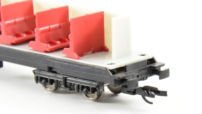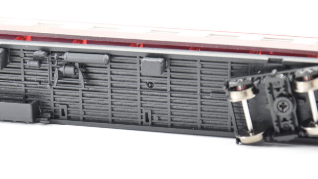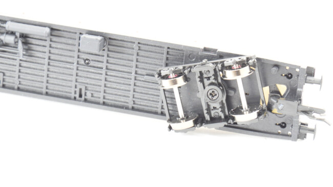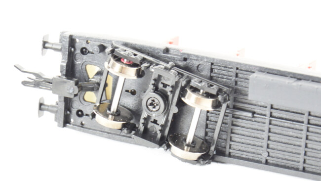 Podvozek je uchycený velmi jednoduše, a to šroubkem. Vůz má samozřejmě kovová dvojkolí, uložená v plastovém podvozku. Netočí se úplně na fouknutí větříku, ale jízdní odpor je přiměřený velikosti a délce vozu. Motorový vůz by si s dvěma vozy měl poradit i do rozumného stoupání, delší rychlíky tažené lokomotivou nejsou problém.