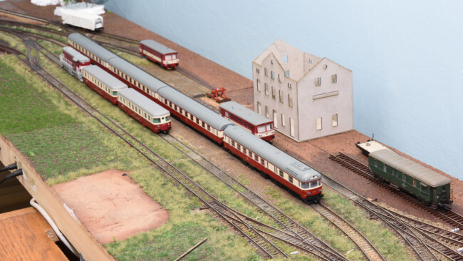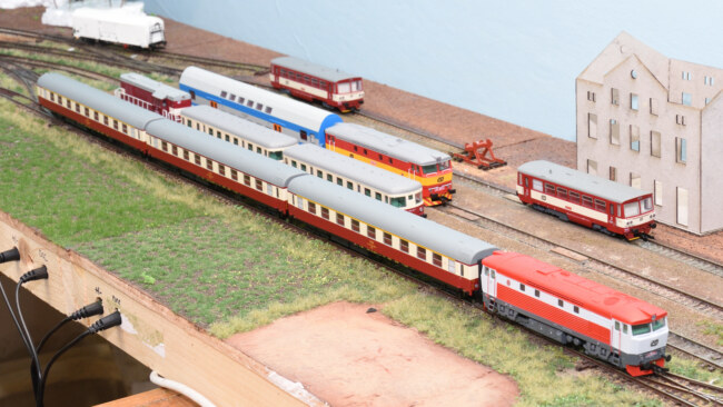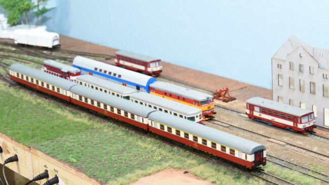 • MTB mě na podzim hodně potěšilo soupravou socialistické Vindobony. 2 motory + 3 vložené vozy, souprava akorát na mé kolejiště. A jak je u MTB zvykem, koupil jsem si polotovar. U obou motoráků hned vypadl kardan (skoro kompletní rozborka, nasazení a upravení vzdáleností uchycení kardanu) Vyměnil jsem všechny spřáhla za vodivá magnetická, do přívěsných vozů doplnil osvětlení od Peliho a celou soupravu elektricky propojil (napájení soupravy z motoráků). Interiér osadil figurkami z AliExpressu ( velikost 1:150, byli nebarvené, tak největší piplačka byla je trochu nabarvit, ale byli za pusu). Jezdí bez problémů, na kolejišti vypadá dost dobře. Ještě 5 let zpátky by mě vůbec nenapadlo, že ně co takového, bude na mém kolejišti jezdit.