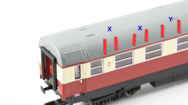 Z jedné rozmazané fotky se domnívám, že střecha není správně. Na straně, kde nejsou mřížky ventilátorů topení (tedy na tom představku, kde není nic), se má nacházet jeden dekl, pod kterým byla nádrž na vodu. Označeno zde na voze Aam, kryt je zřetelně vidět nad oknem WC. Podobná (ale horší) fotka a zajímavé čtení o Vindoboně je na Želpage. Další nepřesností je rozmístění větráčků na střeše – vozy oddílové mají dva větráčky na jedné straně uprostřed vozu, ale střecha modelu má 4 větráčky rozístěné pravidelně po střeše, což odpovídá velkoprostorovým vozům Baim. (Zdroj fotky: https://seznam.cd.cz/assets/zeleznicar/hlavni-zpravy/vind1500-_3_.jpg)