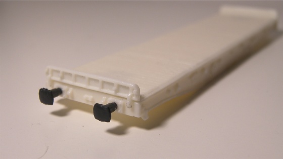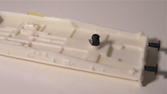 Nyní už je čas přilepit přiložené lisované nárazníky SDV. Podkladnice už jsou součástí odlitku a mají zvětšené otvory, takže nárazník jde pěkně volně zasunout. Stačí přilepit kapičkou vteřiňáku.