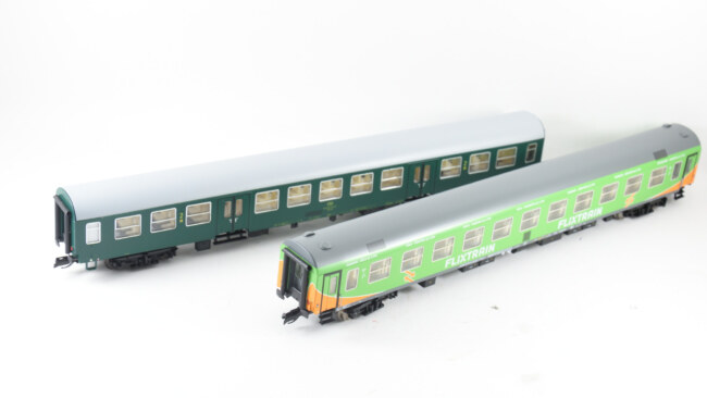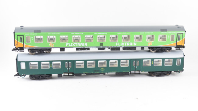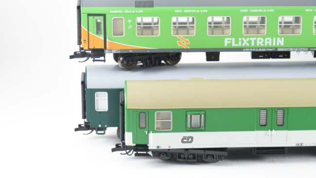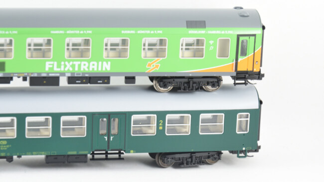 Vlevo původní nebymák – je vidět, že ten vůz je prostě užší a hranka pod střechou větší. Proti tomu Flixtrain vpravo vypadá trošku uhlazeněji.