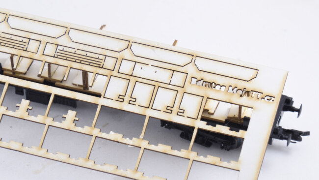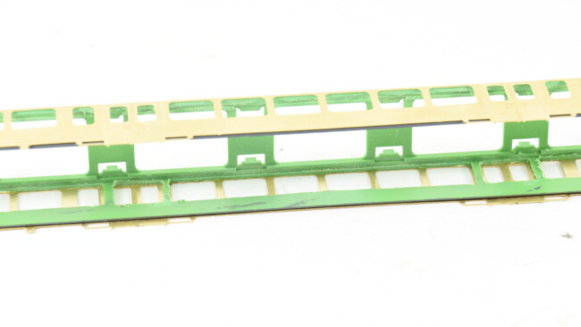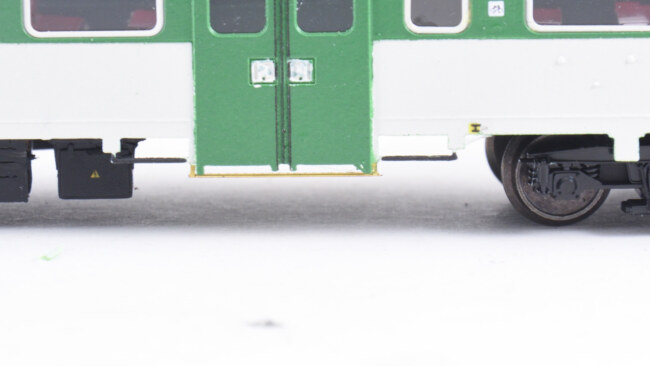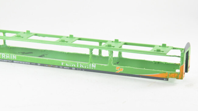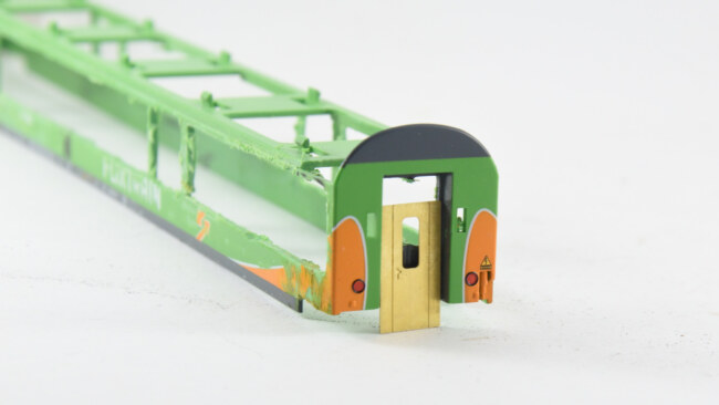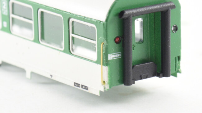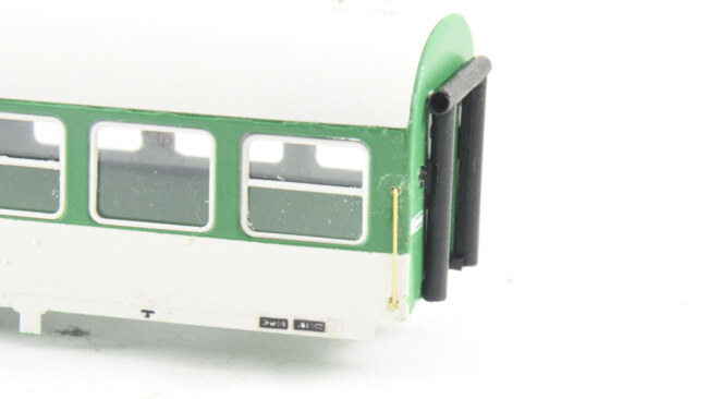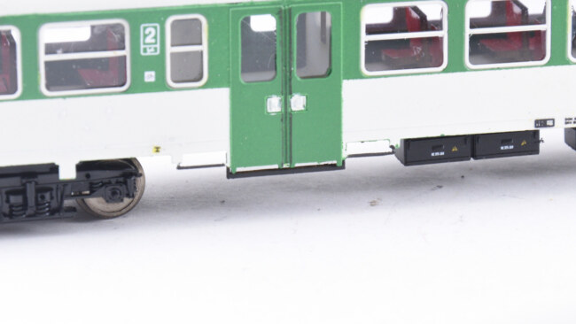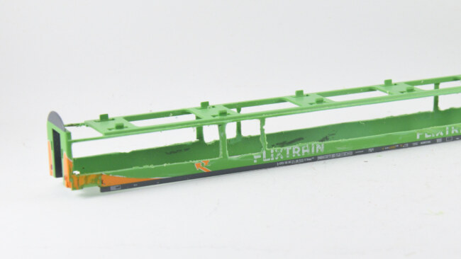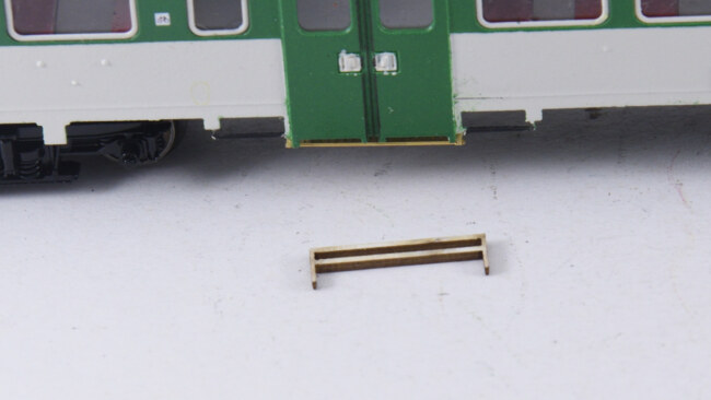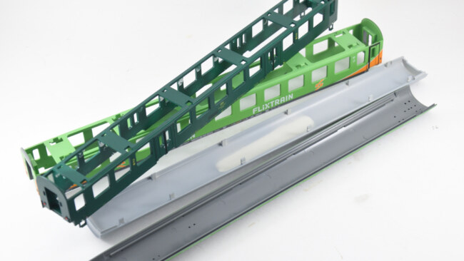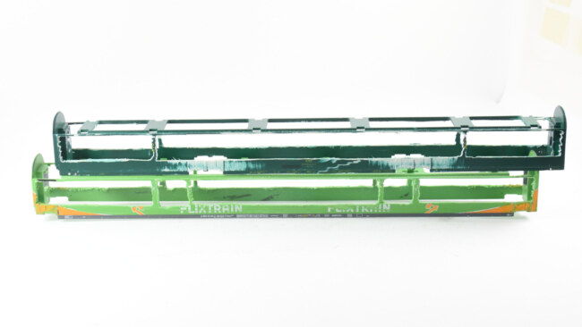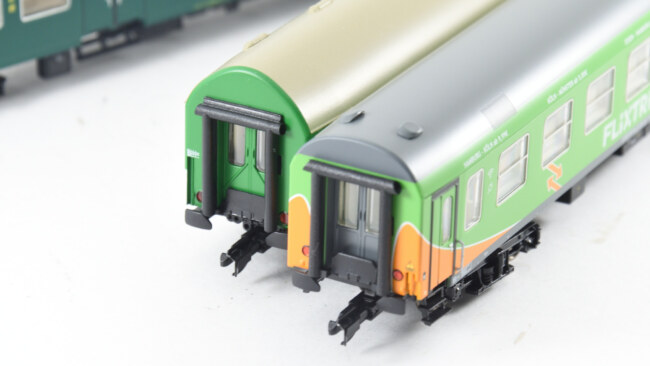 Stupačky na „flixtrainu“ se musí vyřešit jinak – původní plastová bočnice je zde vykousnutá v prostoru původních dveří, takže je možnost nalepit stupačky rovnou zevnitř leptu, nebo opět lept vypodložit třeba kouskem plastu. Naopak výhoda, že se dají lepit stupačky bez úpravy vcelku. Nevýhoda bude jejich větší přesah mimo profil vozu. Musí se to vyzkoušet na kolejišti, jestli to někde nepřekáží.
