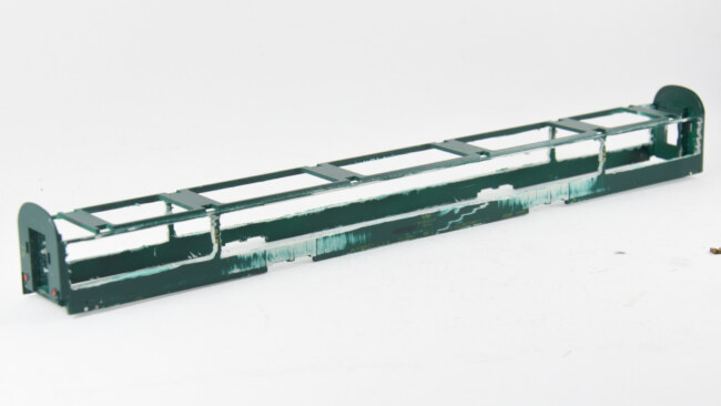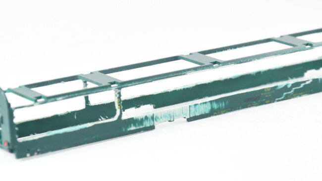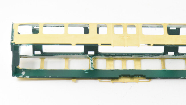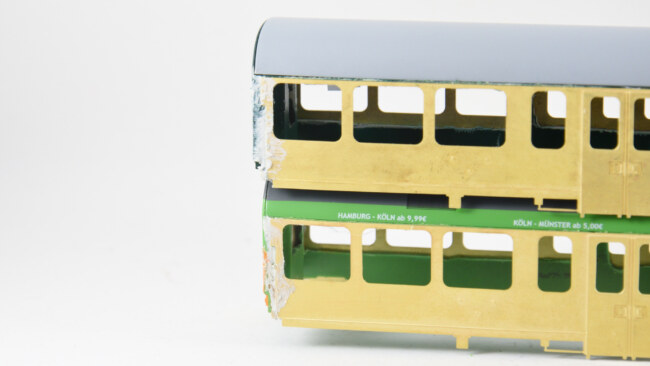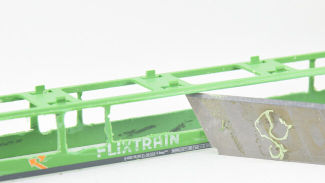 U obou vozů by se celkem šiklo, aby někde zůstaly nějaké příčky – bude se ubírat hodně ke kraji a pevnost skříně to ovlivní. Takže jsem si zkusil naznačit, co by šlo teoreticky zachovat a podle toho řezat. U nebymáku můžou zůstat 2 příčky, u flixtrainu dokonce 4 příčky. Nutné to není, vůz má po přilepení leptu slušnou pevnost i tak.