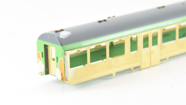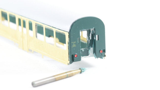 Roh vozu jsem se rozhodl řešit u testovacích vzorků „kamufláží“ skrz madlo – je naznačený výkus pro madlo, ale dál už lept nepokračuje – zde se hrana přetmelí a zakryje částečně madlem.
