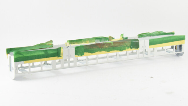 A druhý vůz páskou Tamiya 10mm šířky, skoro z jednoho kusu. Nalepil jsem celý bok, a nožem rozřezal na hraně dveří. Velmi rychlá a efektivní metoda maskování, linka bude v jedné výšce.