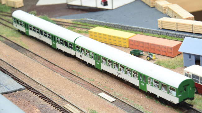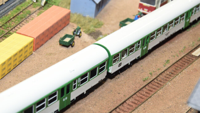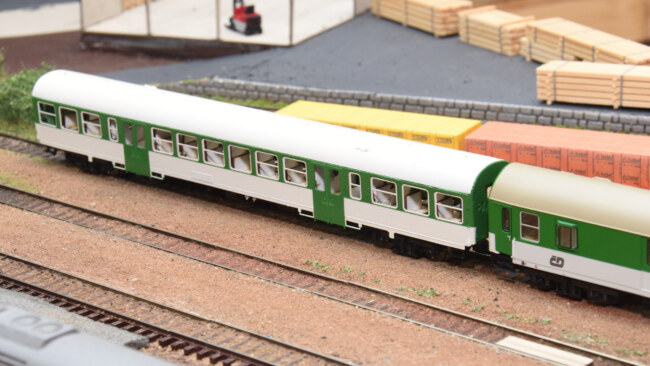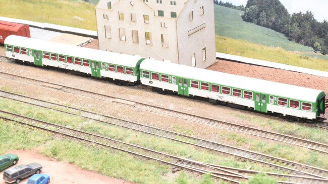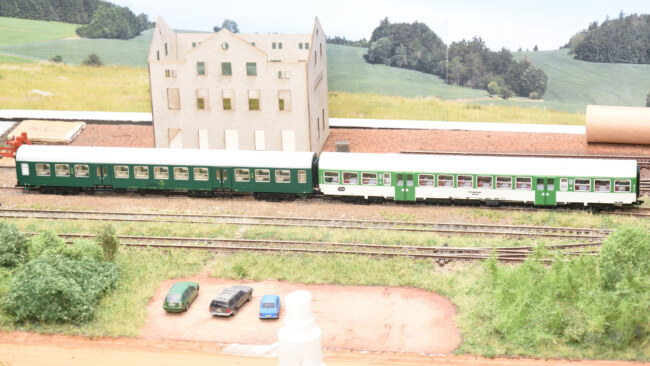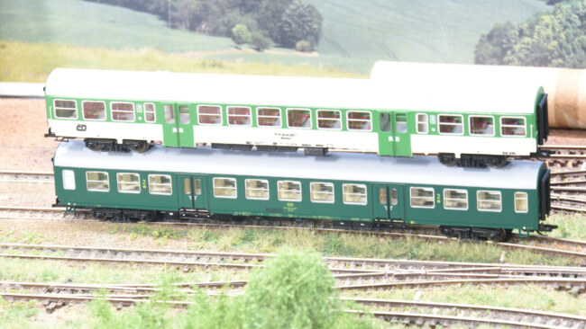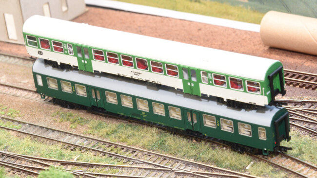 V porovnání s továrním vozem BDs od Tilliga – výška usazení vozů je shodná, rozdíl ve tvaru střechy je dobře znatelný.