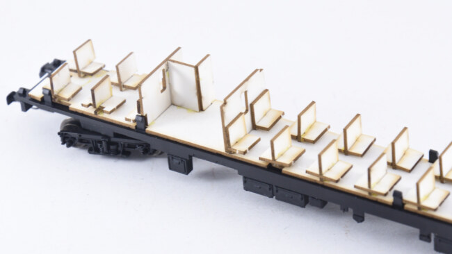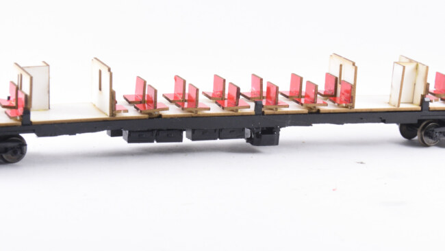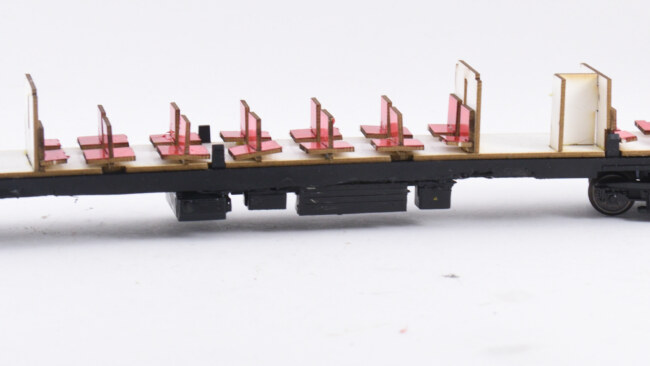 Po sestavení zbydou ještě sedačky na čela vozů – na ty už není v kartonové části prostor, je možné je přilepit napevno zevnitř vozové skříně.