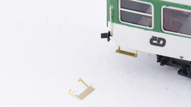 Poslední práce, která se liší dle druhu použitého vozu jsou stupačky a nástupní schody. U „nebymáku“ je nejlepší nalepit stupačky posunovačů zespodu skříně – protože tam ale překáží čelník, je potřeba buďto ofrézovat čelník, nebo rozstřihnout stupačky a nalepit je kolem čelníku. Madla jsem natřel bílou (světle šedou) až na voze, kapkou barvy jsem zalil otvory po vrtání.