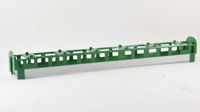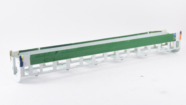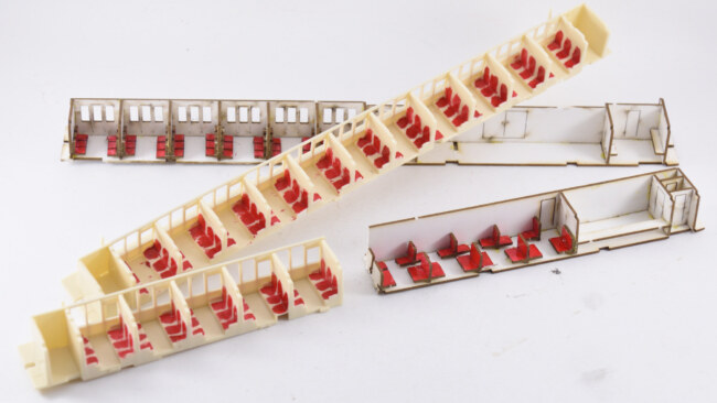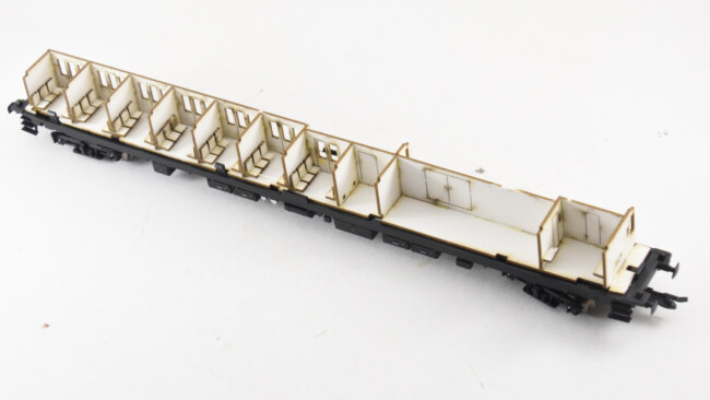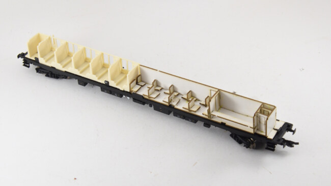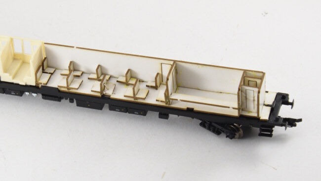 Půlka se použije z původního vozu – proto je potřeba sehnat vůz s 11 oddíly. Použije se WC a pět oddílů, odřezal jsem žiletkovou pilkou. Existují i verze vozu Tillig s velkoprostorovou střední částí, proto při výběru pozor. Kdo by potřeboval dodat přesto oddílový interiér z důvodu špatně vybraného dárcovského vozu, napište mi. Určitě mi budou nějaké interiéry zbývat.