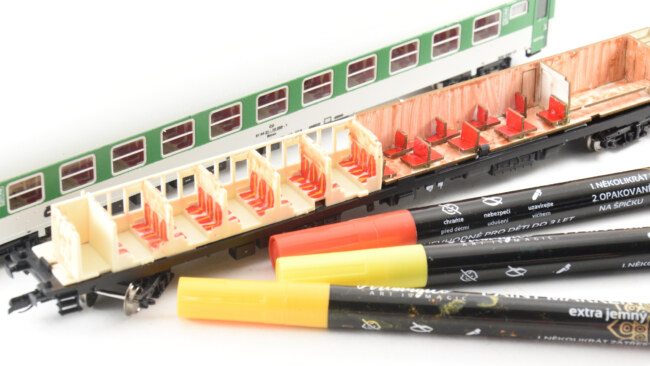 Oranžovou linku jsem do sedaček dodělal pomocí akrylových fixek. Díky ní to vypadá hotově. Interiér BRcm jsem ještě natřel štětcem řídkou hnědou barvou jako imitaci tmavší dýhy stěn.